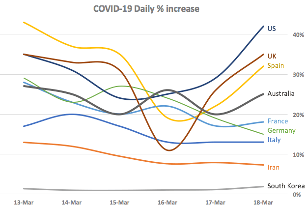 Obviously decision made 2 weeks ago are impacting these figures and will continue to because of the long incubation time. The US had slow rollouts of testing (which is important for proper contact tracing) & the UK briefly had a callous, academic-nutter approach to the pandemic and I suspect we will see that pan out over the next week.