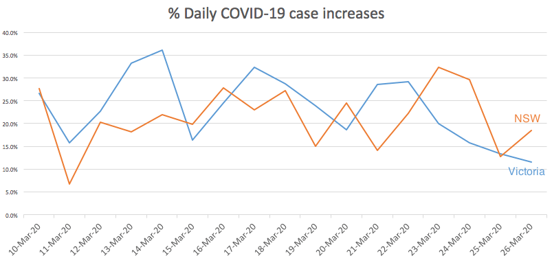 The effects of social distancing are most systematic in Victoria where the 20-30% daily increase has dropped every day for four days and is now down to 11.6%. NSW is showing good signs too. It will take another week to see the real affects of so-called Stage II restrictions including the closing of almost all businesses in which people gather together.