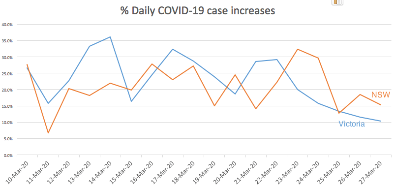 BTW: The chart shows ANOTHER day straight of systematic reduction of % increases in Victoria. We can do it! The best evidence of the effect of social distancing. And none of this can yet show the effect of last week’s restrictions. So look for bigger drops here NEXT week!